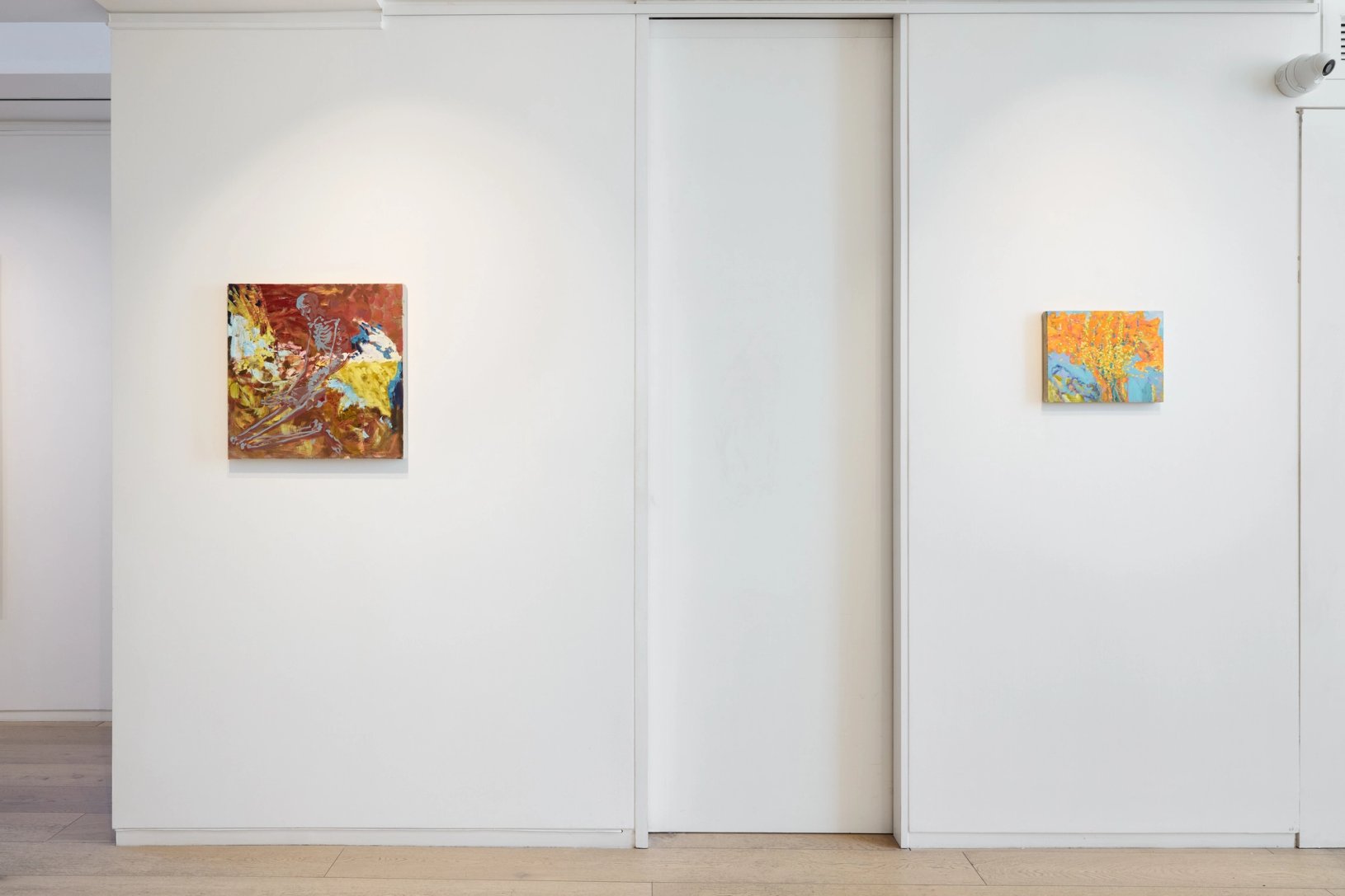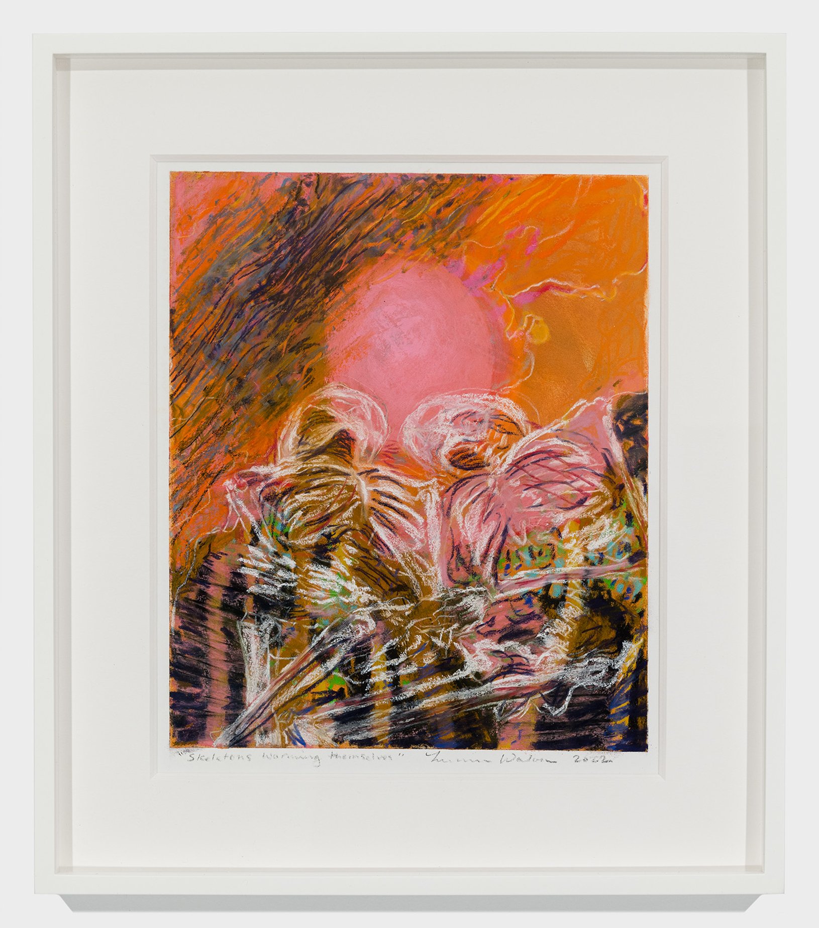 Amongst the more abstract and hallucinatory depictions of the natural world, figurative elements such as skeletal figures stand out. Stripped bare of trappings of time, the skeletons perform their role as humans at a primitive level, while formally their bodies share affinities with those of plants. They curl and twist in similar ways, announcing change even as they symbolize stasis. Like the plants around them, they are caught in the continual state of becoming and dissolving.