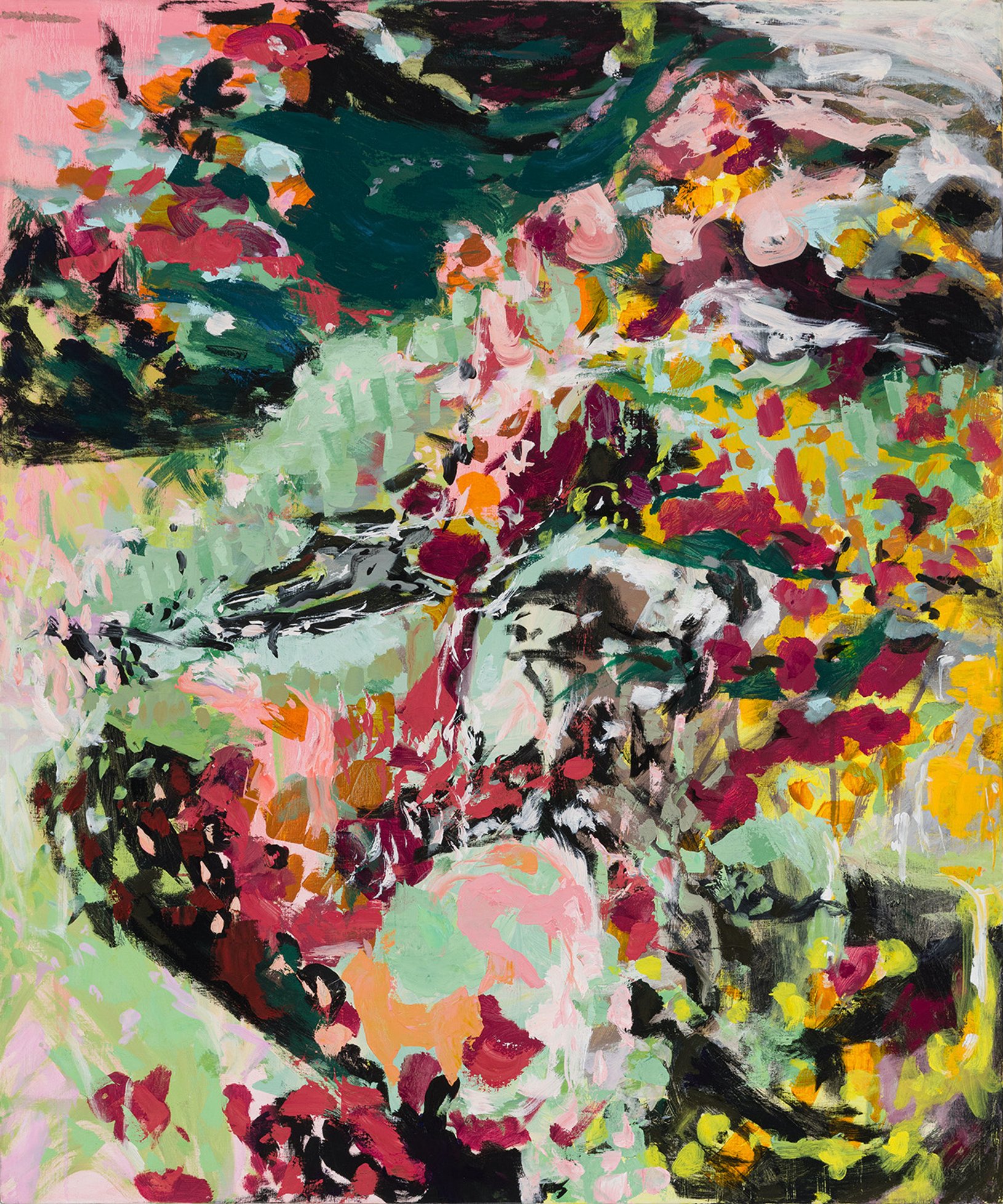 At her first solo show with Taymour Grahne Projects, Wakoa presents a selection of works ranging from dynamic and ambitiously scaled canvases to more intimate framed works on paper. Originally conceived when observing the natural world and then continued in the studio, Wakoa’s compositions are grounded in the tradition of plein air painting and explore the possibilities of art when shifting between abstraction and representation. Drawing inspiration from the trees and plants outside her home in Queens NY, the artist uses observation and imagination in equal measure to produce her lush landscapes. Semi-specific shapes like blossoms one could imagine when looking at the works dissolve into indistinct imagery upon close viewing. Using a diverse vocabulary of mark-making tools she creates particularly rich and textural painterly surfaces where bursts of color and swathing impasto brushstrokes blur the boundaries of the image, creating an optical enigma for the viewer.